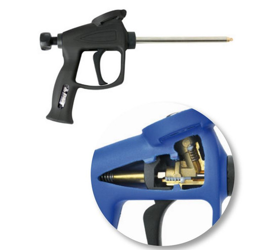 Spray gun designed for the application of single component polyurethane foam, packaged in pressurized cans.