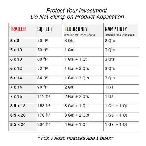 Ordered for my 7x14 enclosed trailer with ramp door. Ordered 3 gallons and had enough to cover the floor LIBERALLY 3 times and the ramp door LIBERALLY 4 times as well as about 4 inches up the side walls with 1 coat just for a little added protection. This stuff rolls on, dries, and cures perfectly. Adds a lot of grit for traction. Going to really put it up to the test this fall during hunting season. 100% recommend to extend the life of your trailer!
