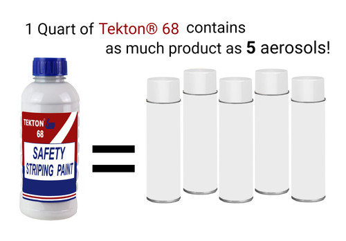 Most aerosol striping paint cans are mostly compressed air with very little usable product. One bottle of TK68 Safety Striping Paint delivers the equivalent of five aerosol cans, providing better coverage, stronger adhesion and lower cost per square foot.